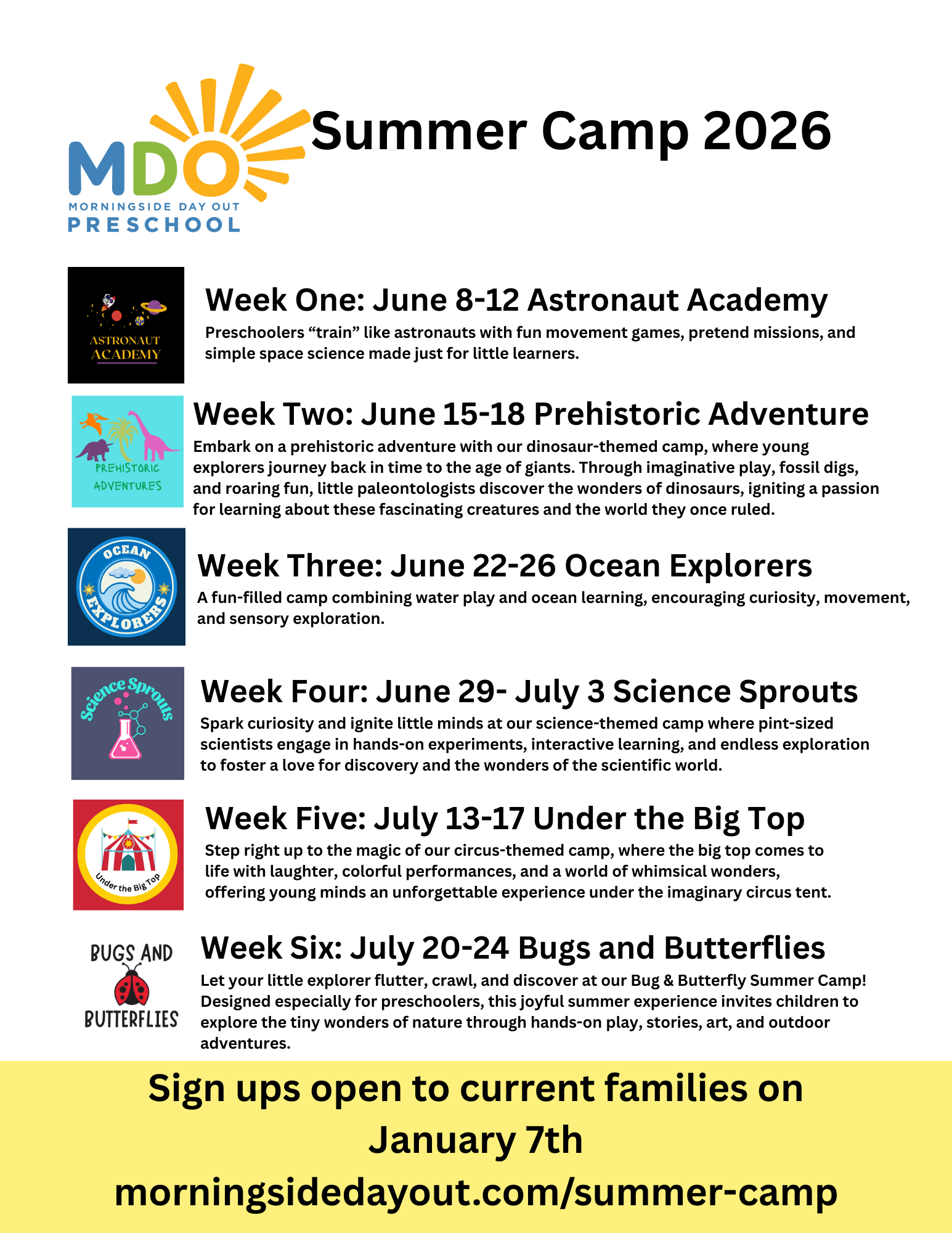 MDO Summer Camp is all about play! Each day includes playground and indoor playtime, sensory activities, art, music, story time, group games, and other unique projects related to the weekly themes. Our summer camp takes place in June and July over 6 weeks, and we offer summer camp for preschoolers and toddlers aged 6 months to 6 years.